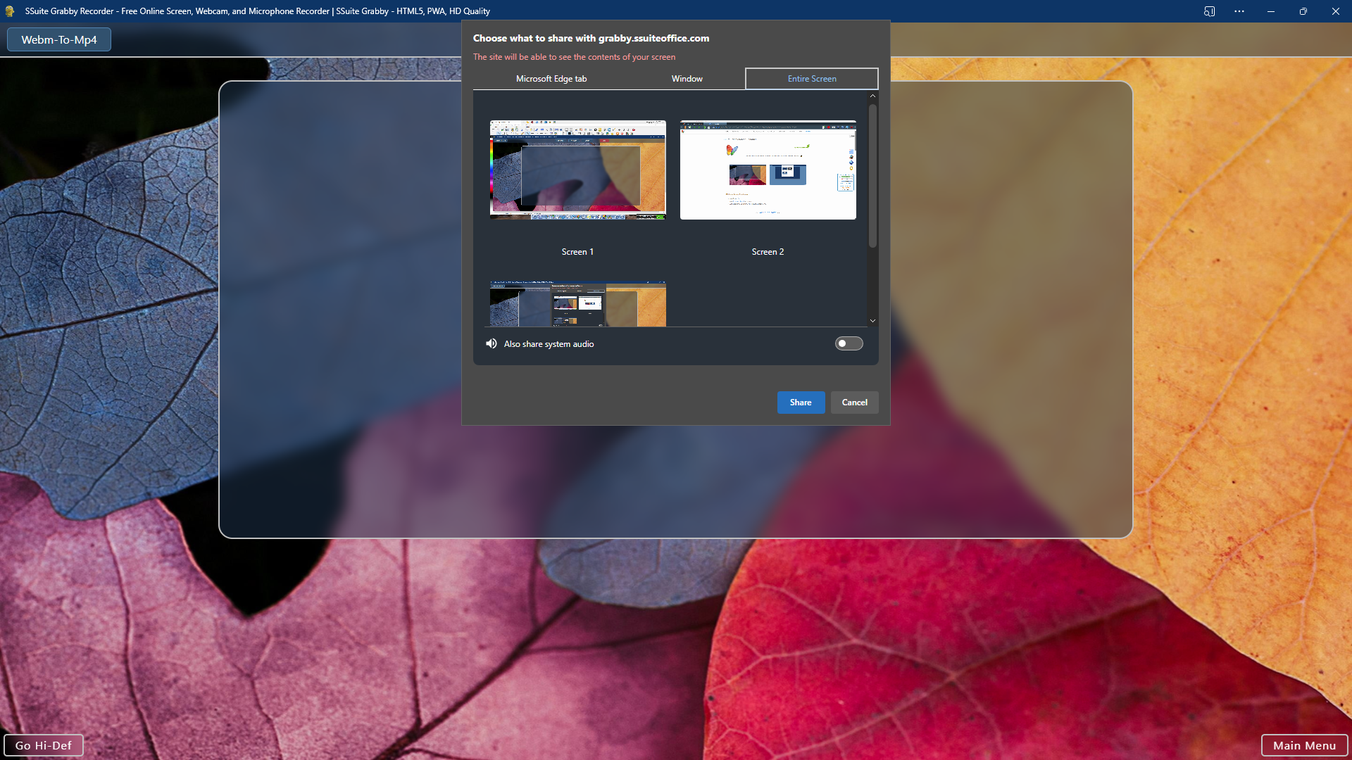 SSuite Grabby is a screen recorder that runs directly inside your web browser using pure HTML5 and javascript code. It utilizes the most efficient audio and video codecs to make web deployment a total breeze and also to make your recordings take up less space on your social media accounts or website. It makes viewing so much faster as it is more compact and faster to render to screen.